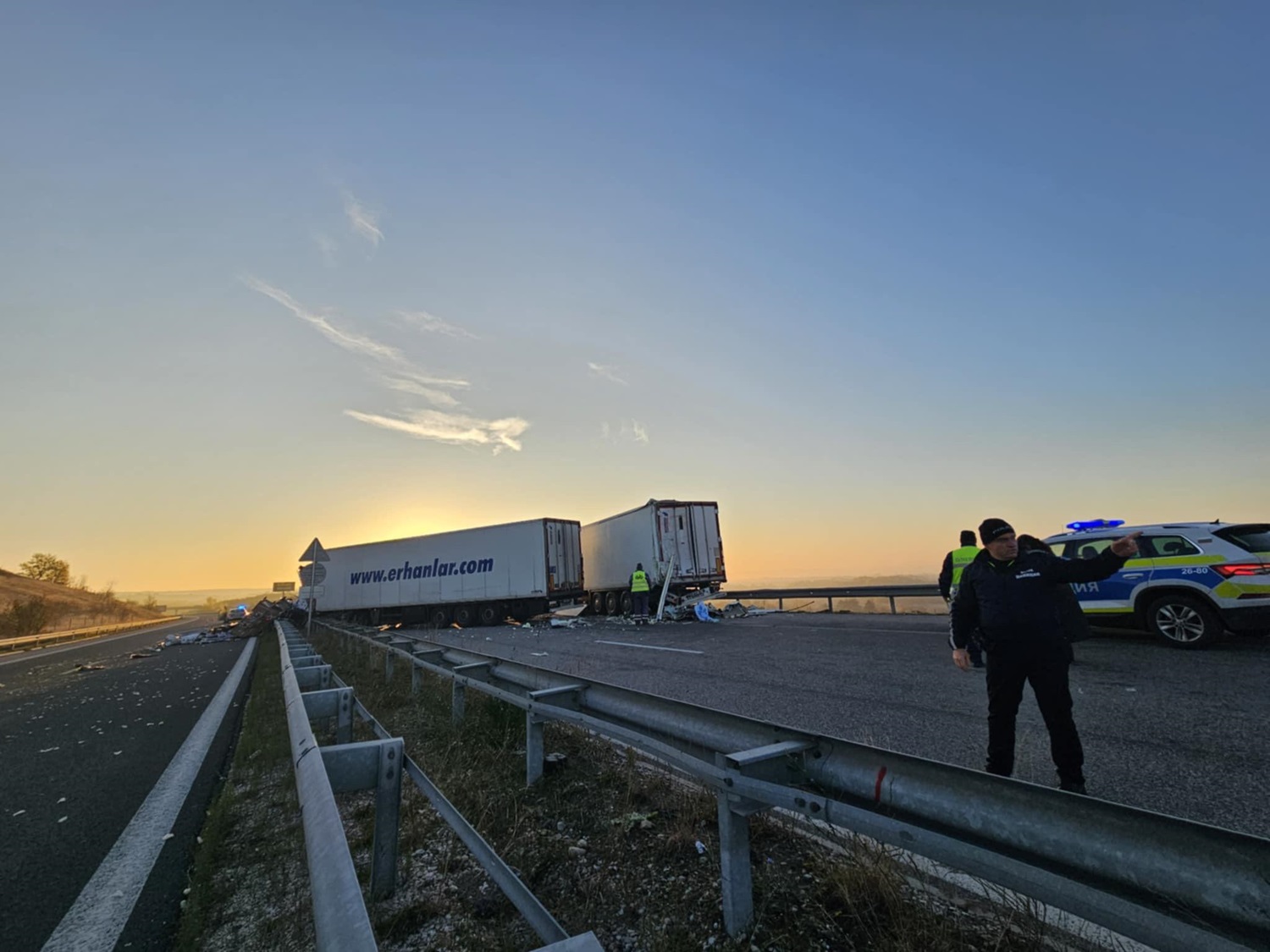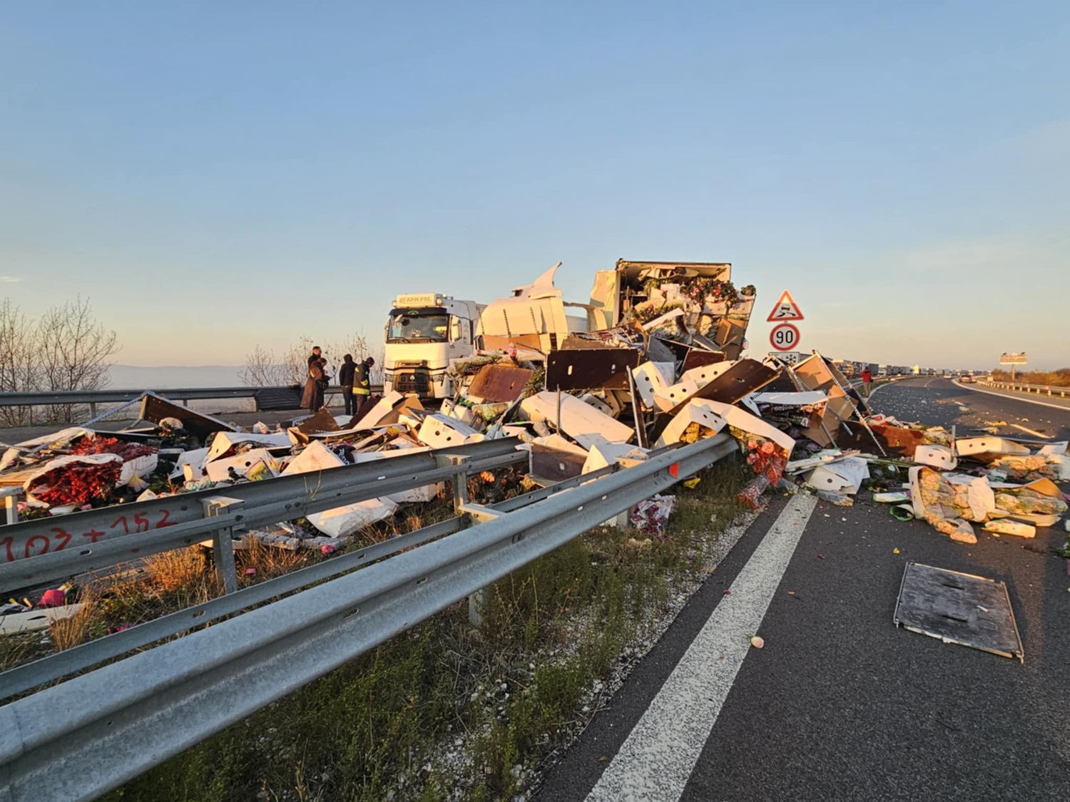Единият камион е превозвал цветя и товарът му е разсипан по пътното платно. Предстои хилядите разпилени букети да бъдат почистени и придвижването да бъде възобновено.