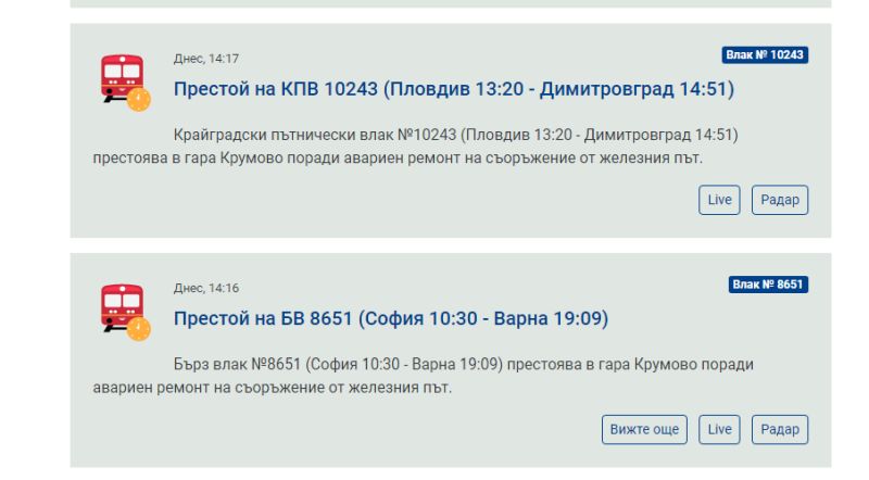 Два влака бяха блокирани на гара Крумово поради развалена стрелка край гарата. Влаковете са за Варна и Димитровград.