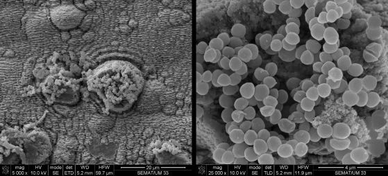 Съвет за електронни медии изображения на лазерно-индуцирани самоформиращи се периодически нано-структури (LIPSS) върху титанова сплав (Ti alloy) и клъстер от бактерии S. aureus, наподобяващ остров, след наблюдаване от 24 часа.