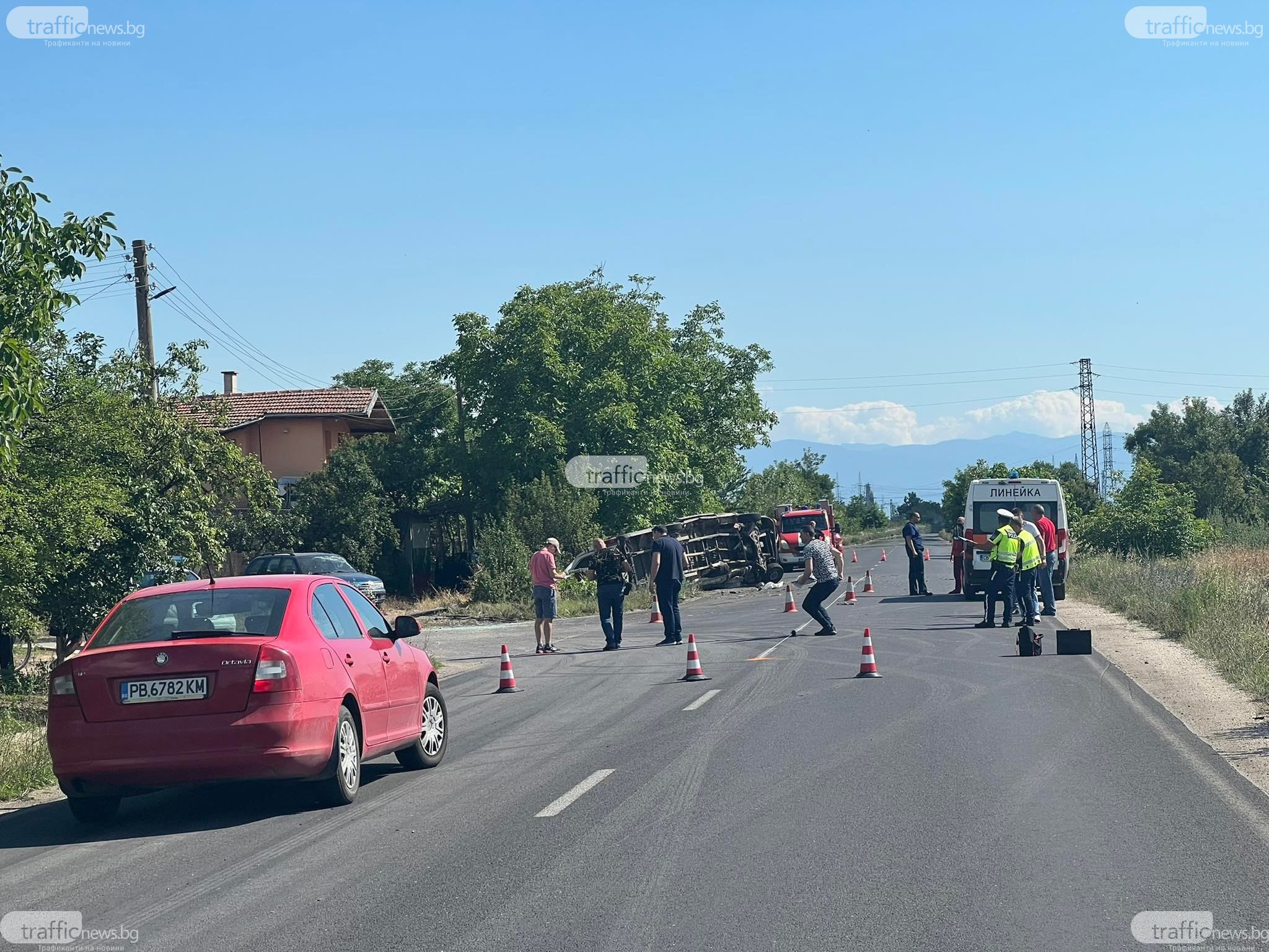 Продължава огледът на мястото на злополуката. Движението по пътя Пловдив- Карлово към момента не е възобновено. Полиция отбива потока през Ръжево Конаре - Конаре и Черноземен.