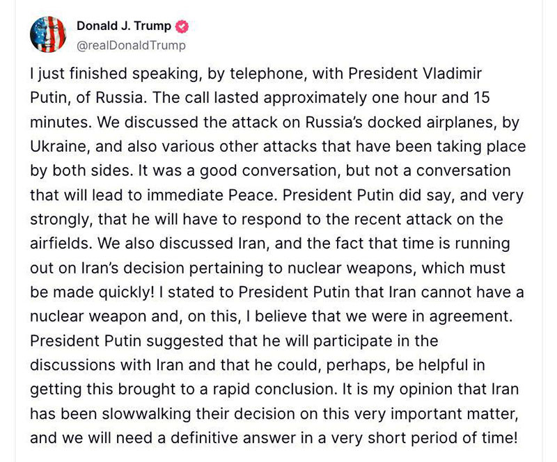 Москва ще отговори на офанзивите на Киев против съветските авиобази - интервенцията, известна под кодовото име " Паяжина ". Това е декларирал президентът на Русия Владимир Путин в телефонен диалог с американския си сътрудник Доналд Тръмп по темите за Украйна и Иран, оповестява самият Тръмп в обществената си мрежа Truth.