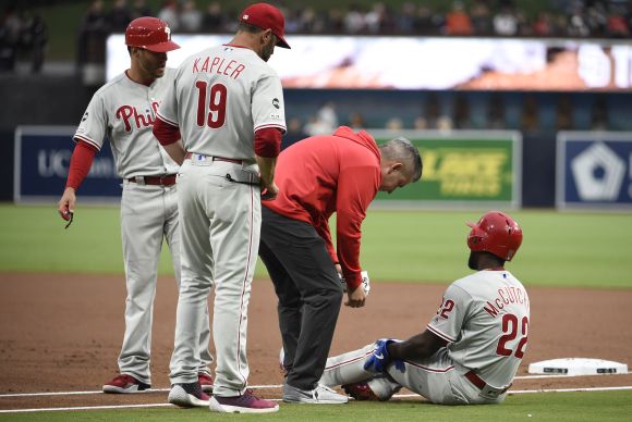Най-стряскащата вест за Фили пристигна още в 1-вия ининг, когато стана ясно, че откриващият остроумен Андрю Маккъчън би трябвало да бъде заменен наложително. Централният аутфилдер по този начин и не влезе в отбрана, откакто в нахлуване беше заловен в ръндаун сред първа и втора база и в опит да избегне аута стъпи изкривено и усука лявото си коляно. Предстои обзор с ядрено-магнитен резонанс, с цел да бъде открито какъв брой съществено контузен е 32-годишният някогашен MVP в Националната лига.