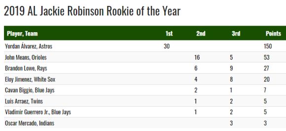 Двамата най-впечатляващи млади бейзболисти в МЛБ предстоящо взеха премиите " Новобранец на годината " за сезон 2019 във Висшата лига на Съединени американски щати и Канада. В Американската лига Йордан Алварес (Хюстън Астрос) събра оптималните 150 т. от вота на асоциацията на бейзболните публицисти (BBWAA), откакто беше подложен преди всичко във всяка от 30-те анкетни карти. В Националната лига пък Пийт Алонсо (Ню Йорк Метс) получи поддръжката на 29 от участниците в гласуването, а един го сложи на второ място за общ брой от 148 т.