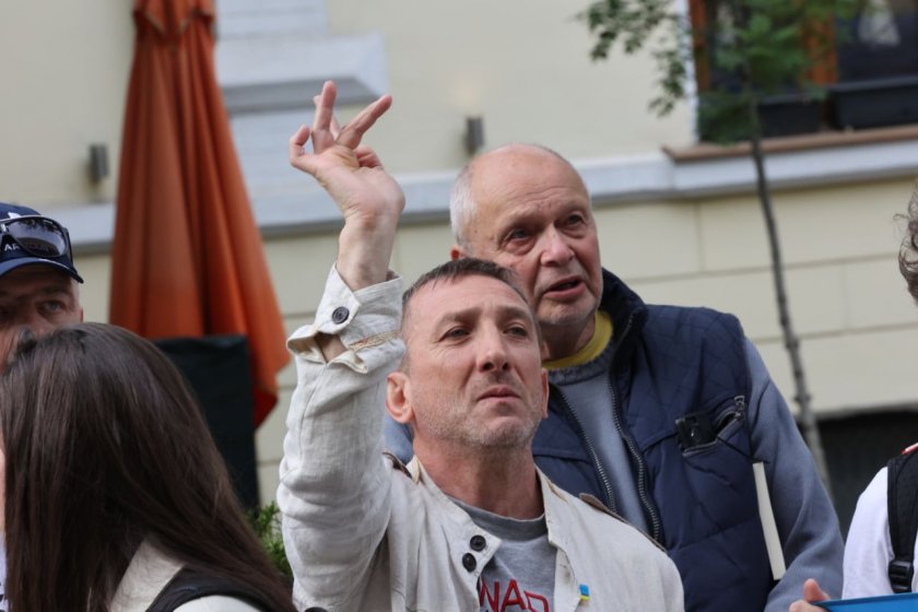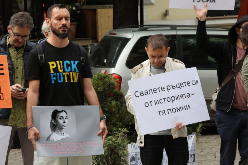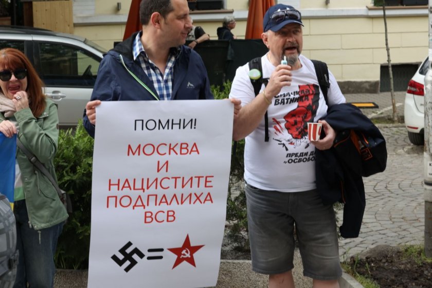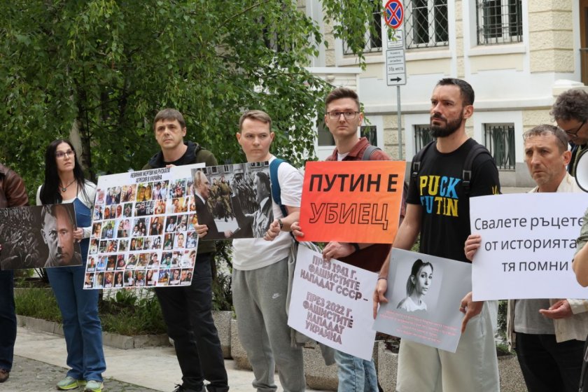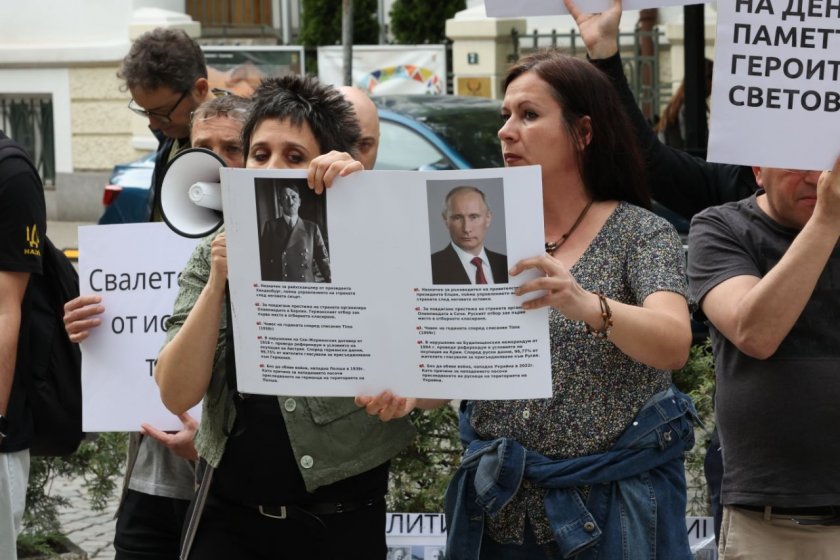 Събралите се скандираха - „ Путин фашист “, „ Тук не е Москва “ и „ България не е Русия “. Част от протестиращите държат флагове на Украйна и носят плакати с надписи: „ Днес фашисткият режим е в Русия “, „ Свалете ръцете от историята, тя помни “ и други.