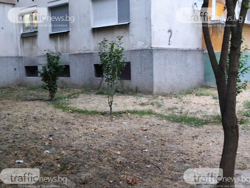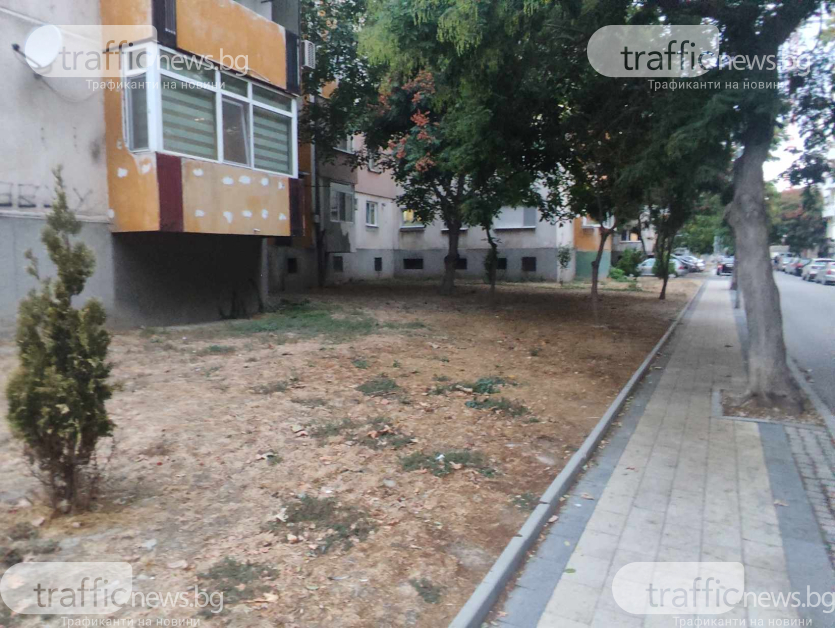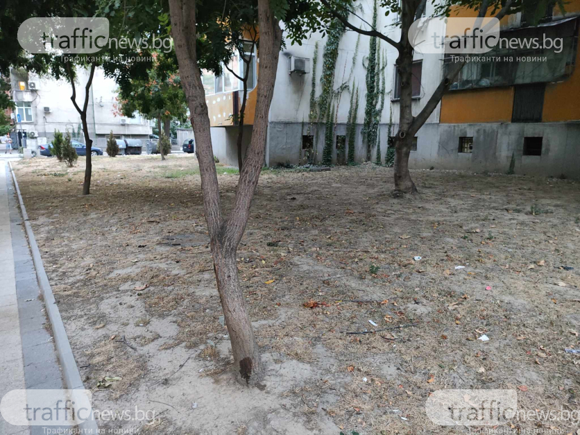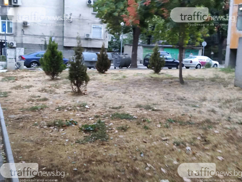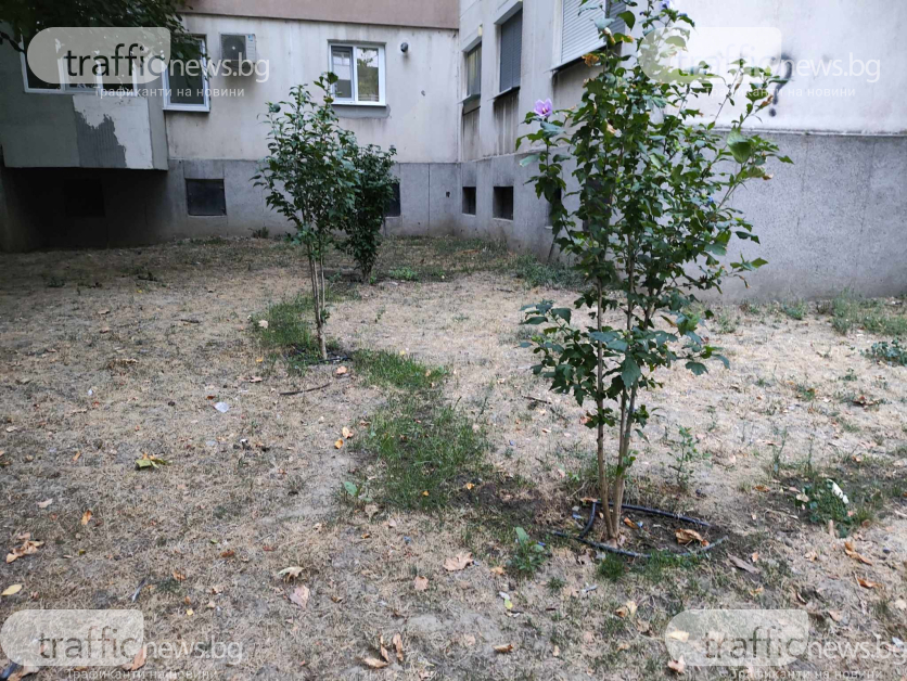 Така два години по-късно тревата е жълта, съвсем всички дървета са изсъхнали, като изключение вършат няколко борчета и три фиданки. За последните обаче има справедлива причина. Пловдивчанин, който живее в блока е направил спонтанна поливна система с маркуч от мазето си. Видно е по какъв начин по пътя на маркучите е зелено, а самите дръвчета са се хванали.