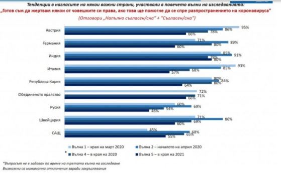 Така, макар че обществото ни все по-ясно осъзнава опасността, критичността към загубата на съществени човешки права пораства. В началото на пандемията делът на изразяващите подготвеност да се откажат от някои от човешките си права доближаваше до 83%.