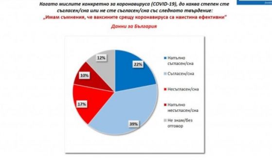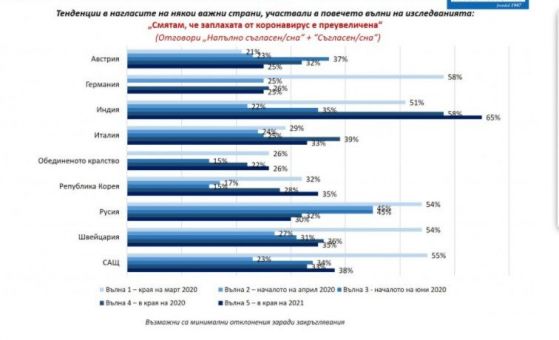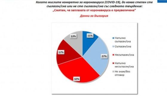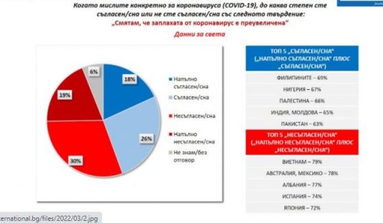 След две години живот в изискванията на световна пандемия българите са във все по-малка степен склонни да подценен заплахата от коронавирус. Така през март 2020 година 72% от интервюираните у нас смятаха, че заплахата е пресилена, в края на предходната година бяха 42%, а в този момент са 38%. Разбира се, следва да се има поради, че настоящата вълна на проучване беше извършена в разгара на последната тежка вълна на ковид в страната и това в допълнение изостри публичната тревога по тематиката.