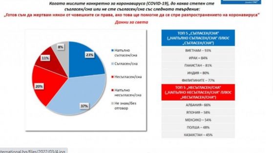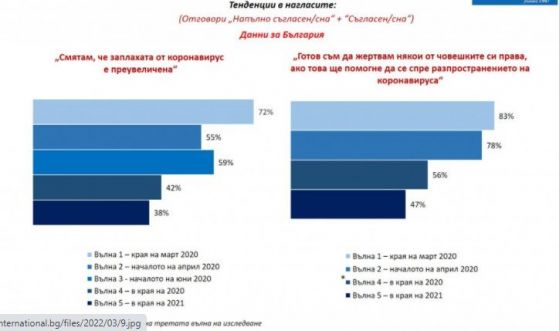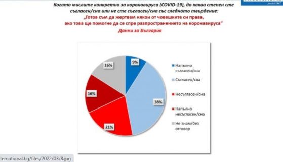 След две години живот в изискванията на световна пандемия българите са във все по-малка степен склонни да подценен заплахата от коронавирус. Така през март 2020 година 72% от интервюираните у нас смятаха, че заплахата е пресилена, в края на предходната година бяха 42%, а в този момент са 38%. Разбира се, следва да се има поради, че настоящата вълна на проучване беше извършена в разгара на последната тежка вълна на ковид в страната и това в допълнение изостри публичната тревога по тематиката. Въпреки че обществото ни не гледа с неуважение на опасността, готовността за жертване на човешки права у нас спада през последните две години. Сега 47% у нас декларират или твърдо декларират, че са подготвени да се откажат от някои от правата си, в случай че това ще помогне да се спре разпространението за болестта. 37% са на противоположната или на извънредно противоположната позиция. 16% не могат да преценяват.