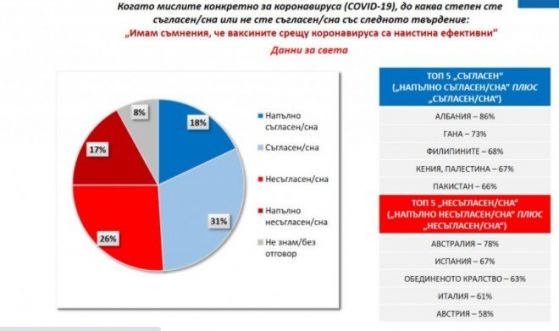 Сянката на подозрение в успеваемостта на главното средство в битката против болестта – имунизациите – пораства. Половината от участвалите в проучването по света не са сигурни дали имунизациите в действителност работят. Възприятията за коронавирус като опасност по-скоро се резервират.