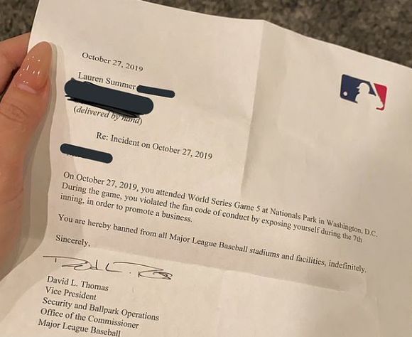 " Зрителките, които изложиха телата си на показ на ст. " Нешънълс Парк ", нарушиха етичния кодекс за държание на бейзболния клуб на Вашингтон. В резултат те бяха изведени от стадиона и са осъдени със възбрана да посещават мачове от МЛБ за неопределен срок ", написаха от Мейджър лийг в своето публично известие.
