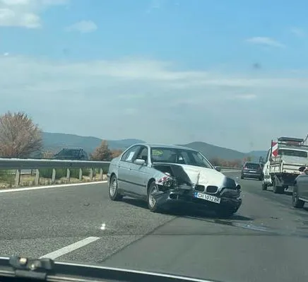 Лекият автомобил се е завъртял на пътното платно. Двете машини са спрени в дейната лента, което създава километрична запушалка.