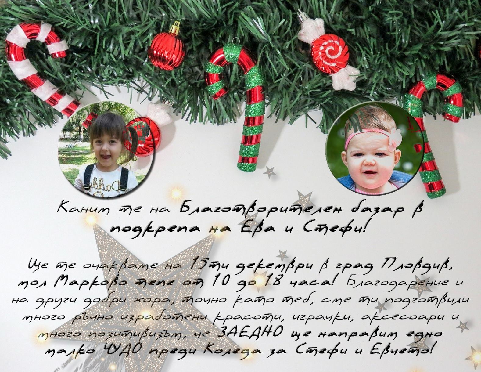 „ Каним Ви на Благотворителен базар в поддръжка на Ева и Стефи! Хубаво е когато положителните хора се събират на едно място с цел да вършат чудеса.