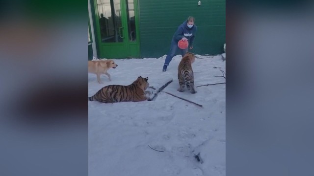 Игра в снега: Тигърчета, куче и трикрако лъвче се забавляват с топка