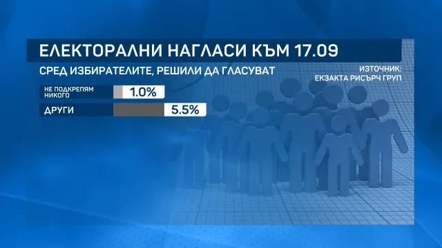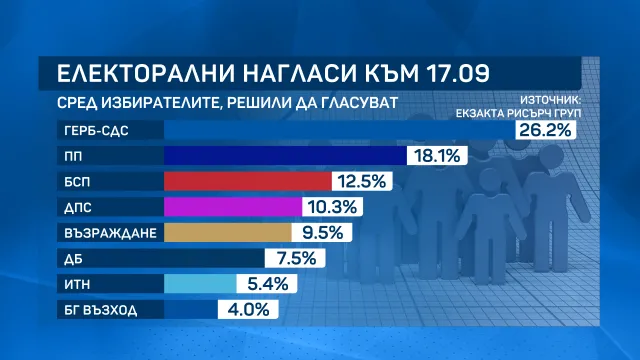 Изводът е от национално изследване на „ Екзакта Рисърч груп “, извършено в интервала от 10 до 17 септември посредством изявление лице в лице на 1050 пълнолетни българи. Изследването е осъществено със средства на „ Екзакта “.
