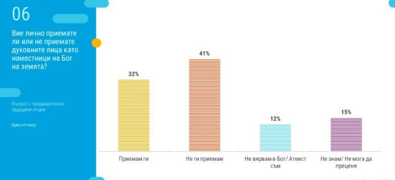 В подтекста на визитата на папа Франциск, " Тренд " ревизира и дали българите одобряват духовните лица като наместници на Бог на земята. 32% от българите показват, че одобряват духовните лица за наместници на Бог на земята. Имайки поради, че 1% от извадката дава отговор на 55 хиляди души, то малко под 1 млн. и 800 хиляди българи одобряват тази позиция за духовните наместници. 41% са на противоположното мнение – не ги одобряват. Видно е от данните, че по-младите българи, за сметка на по-възрастните, в по-малки дялове одобряват духовните лица за наместници на Бог на земята. С увеличението на възрастта нараства делът на хората, които одобряват духовните лица като наместници на Бог. 12% от българите са показали, че не имат вяра в Бог. Младите хора на възраст 18-29 година в максимален дял са атеистично настроени.