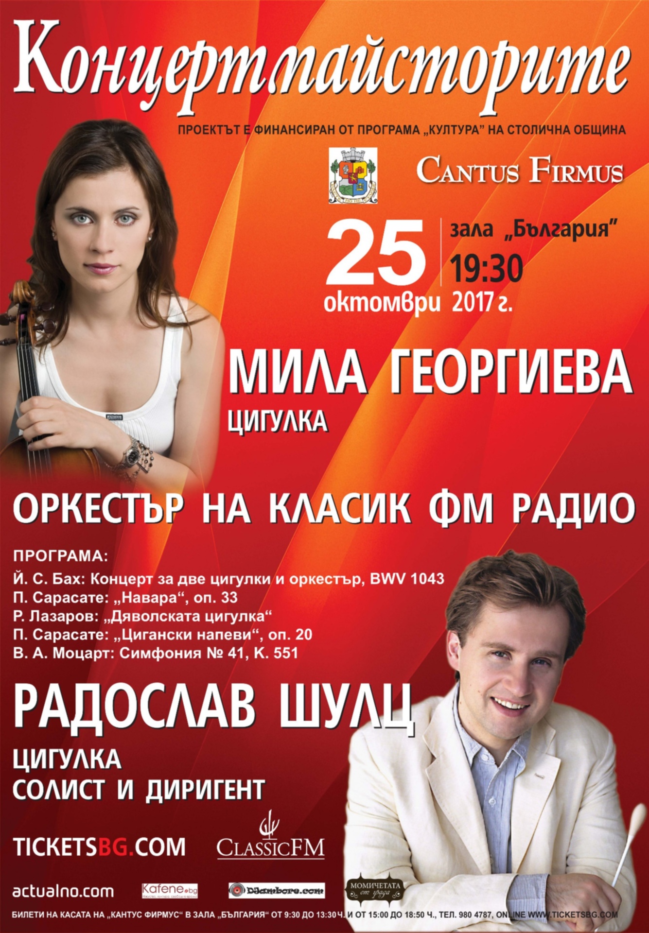 Две цигулки Страдивариус ще чуе българската аудитория в зала „ България “ на концерта на именитата ни цигуларка Мила Георгиева и полския й сътрудник Радослав Шулц. Двамата елитни музиканти ще показват шедьоври за една и две цигулки, а във втората част Шулц ще размени инструмента с диригентска палка. Общата изява на двамата виртуози е част от цикъла „ Концертмайсторите “ с оркестъра на Класик ФМ радио, проведен от „ Кантус Фирмус “. Събитието ще се състои на 25 октомври в зала „ България “ от 19:30 и се финансира от Програма „ Култура” на Столичната община за 2017 година