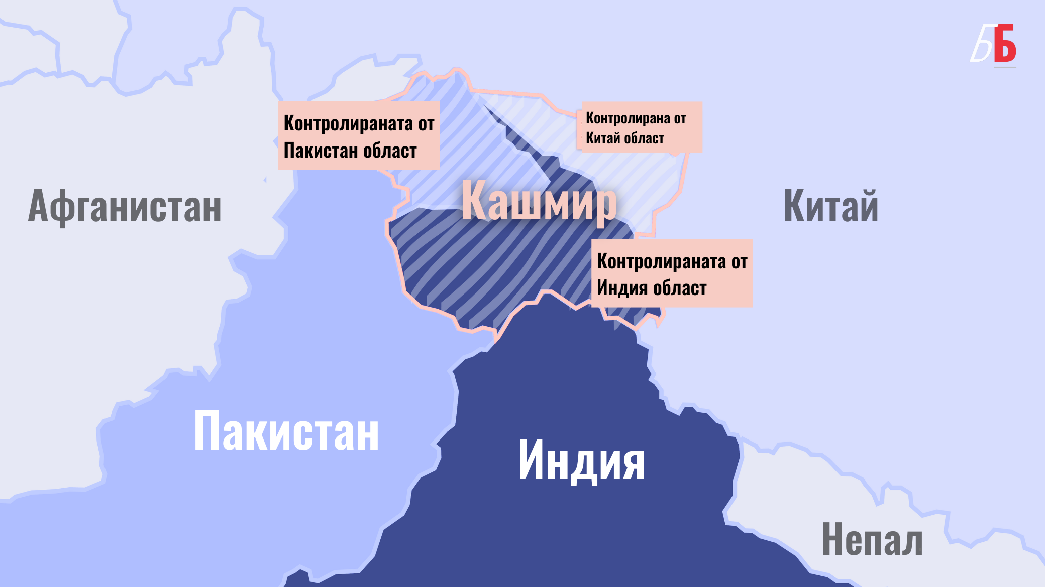 В момента територията е разграничена на две елементи - едната се управлява от Индия, а другата от Пакистан. И двете страни обаче претендират за териториалната целокупност на Кашмир. Там живеят най-вече мюсюлмани.