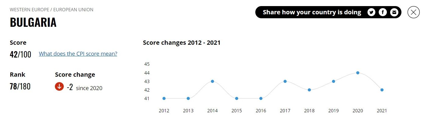 През упоменатата година България е заемала 76 място от общо 180 страни, до момента в който за 2021 година, в която ни управляваха двата служебни кабинета на Румен Радев, към този момент заемаме 78 място, дружно с страни като Буркина Фасо, Бахрейн и Бенин.