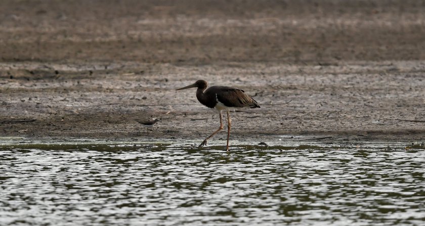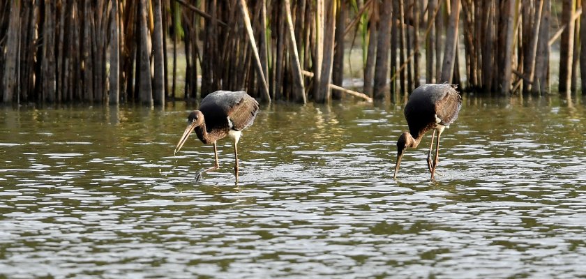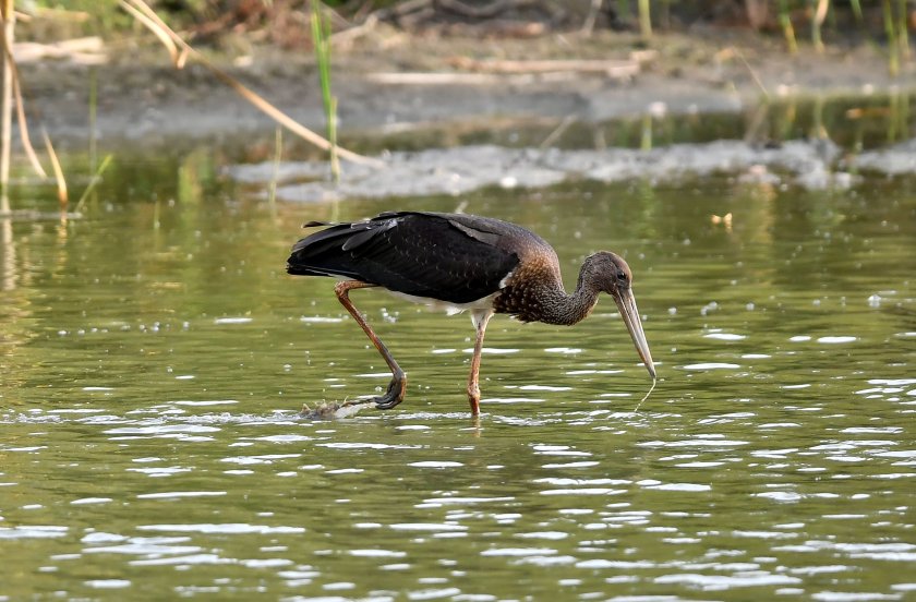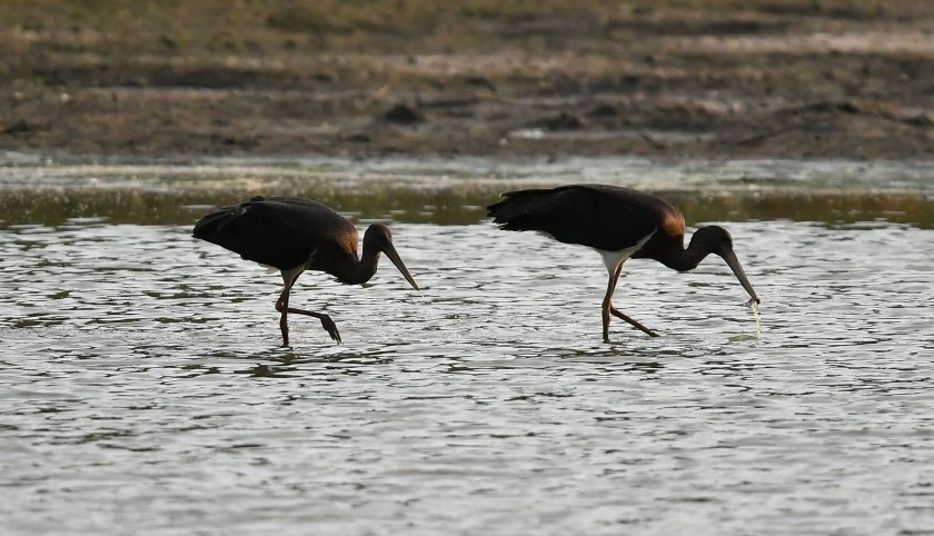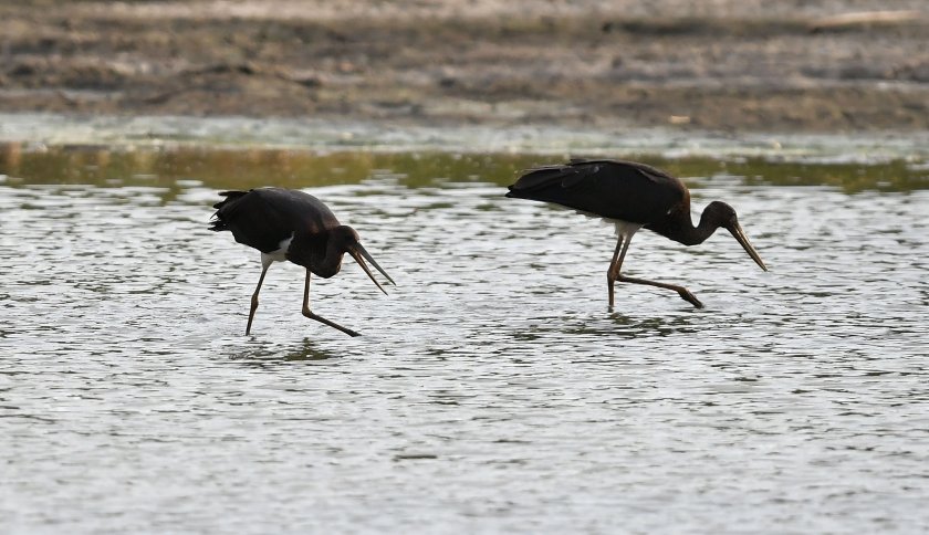 Двойка черни щъркели, които към момента не са мигрирали в южните страни за зимния интервал, са дохвърчали в търсене на храна във водоем, покрай село Малък Поровец, Разградска област.
