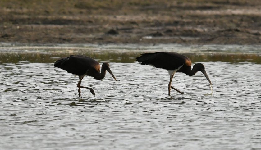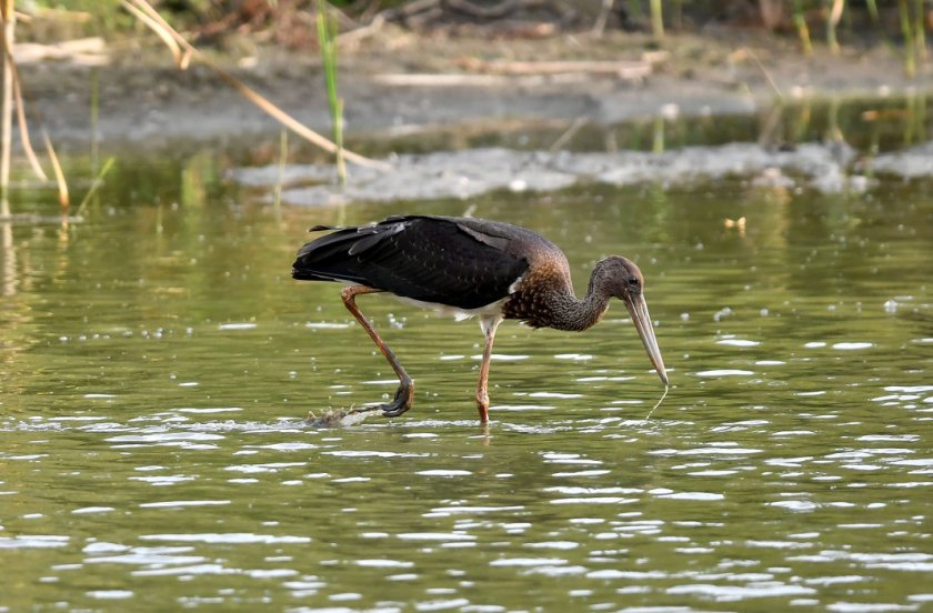 Черният щъркел е по-рядко публикуван тип, ловува, като нагази в плитка вода и хваща своята плячка с дългия си клюн.