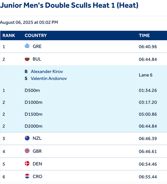 Киров и Андонов финишираха на второ място в предварителна серия №1, откакто изминаха дистанцията от 2000 метра за 6:44.84 минути.