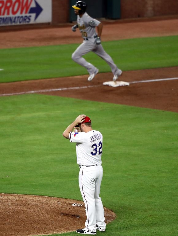 Двубоят сред Тексас Рейнджърс и Оукланд Атлетикс от постоянния сезон на МЛБ тази нощ влезе в 9-ия ининг при тъждество 3:3. Само 6 аута по-късно резултатът към този момент бе 9:4 за гостите от Калифорния и те стартираха със звучна победа гостуването си за тройна серия на ст. " Глоуб Лайф Парк " в Арлингтън.