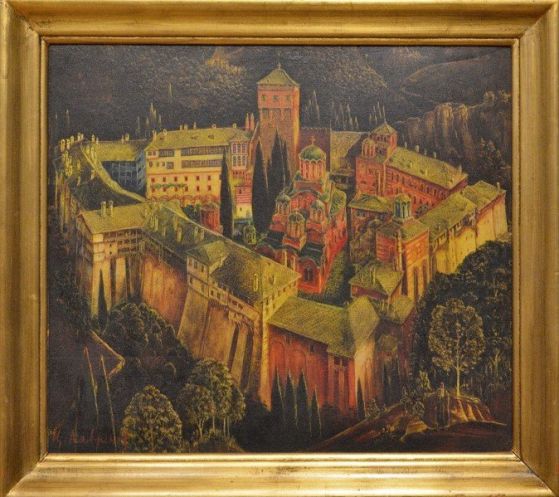 Васил Захариев (1895 – 1971): Изглед от Света гора, Великата лавра „ Св. Атанасий “