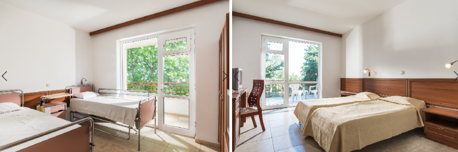В приюта разполагаме с общо 35 светли и просторни двойни и тройни стаи, както и 2 жилището. От стаите, ситуирани на третия етаж се разкрива прелестна панорама към морето. Обзавеждането в стаите се преценява с самостоятелните потребности на всеки пациент, като партерният етаж е очакван и профилиран за по-тежко заболели пациенти.