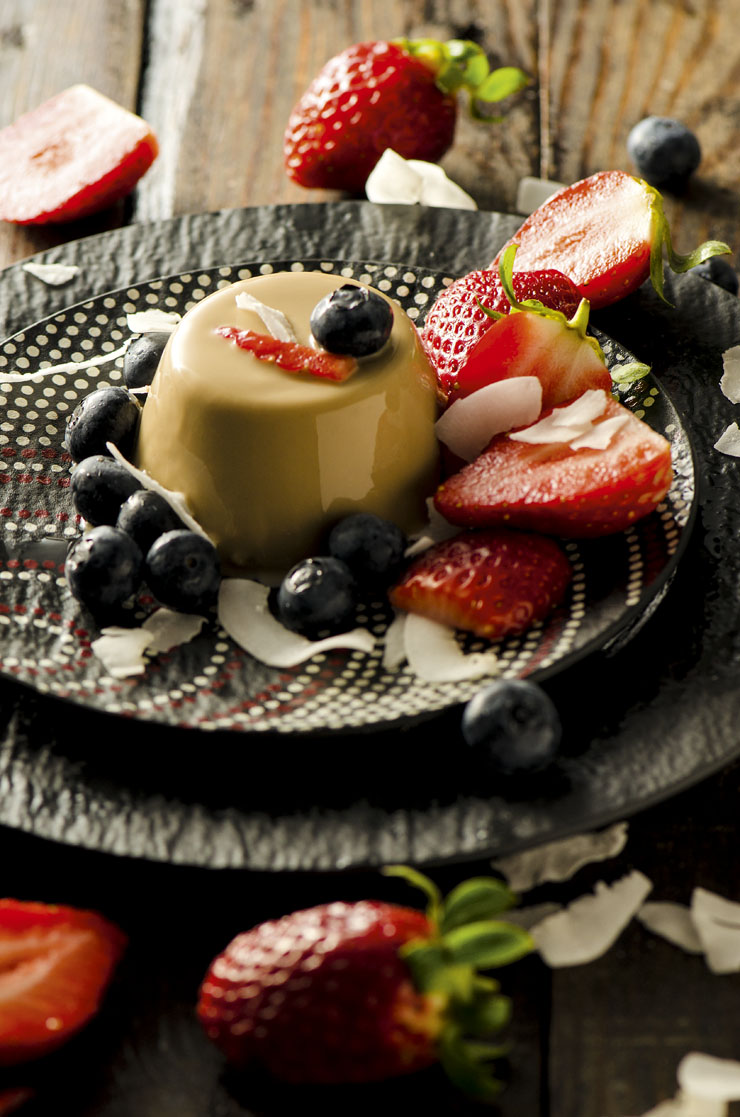 Един гальовен и апетитен десерт с мирис на кафе и доста италианско звучене. Необходими артикули: 1/3 чаша мляко, 2 с.л.захар, 2 ч.л. инстантно кафе, 100 г крем сирене, 1 лист желатин, 6 с.л. вода. Начин на подготвяне: В дребна тенджера загрейте прясното мляко, захарта и кафето, бъркайте, до момента в който се разтвори захарта. Добавете крем сиренето. Накиснете желатина в студена вода за 5 минути. В различен съд загрейте 6 с.л. вода, без да завира, и сложете отцедения желатин да се разтвори. Добавете го към млечната примес. Разбъркайте до гладка текстура. Налейте в две формички и охладете за 3 часа в ледник.Поднесете десерта леден със свежи плодове и кокос.