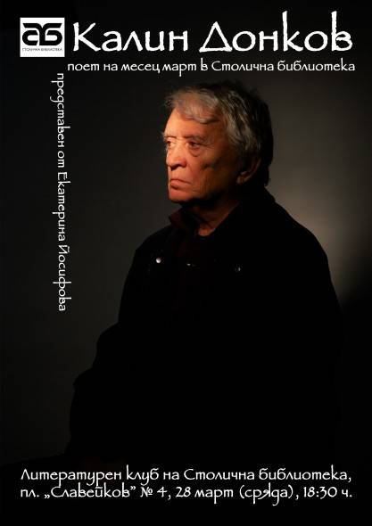 Един от огромните модерни български поети ще се показа на 28 март (сряда) от 18:30 ч. в Литературния клуб на библиотеката. За него ще приказва неповторимата Екатерина Йосифова, която също беше стихотворец на месеца (за февруари), и с която го свързва освен поезията, само че и дългогодишно другарство. Входът е свободен, а книгите на Калин Донков ще бъдат изложени във витрина на втория етаж в Направление „ Обслужване на читатели” през целия месец март. Заповядайте!