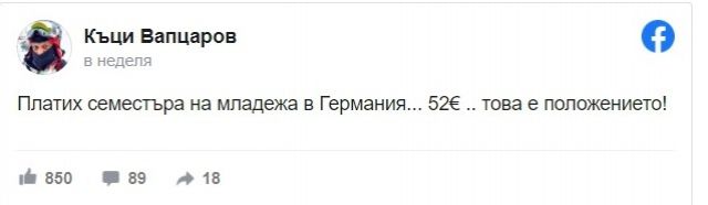 Един от именитите шоумени у нас, Къци Вапцаров, провокира същински гърмеж от мнения във Facebook с последния си пост. Вапцаров, който се завръща на екран от пролетта с предаването „ Риск печели, риск губи “, изненада почитателите си в обществената мрежа със известието, че учебен срок за висше обучение в Германия коства...52 евро!