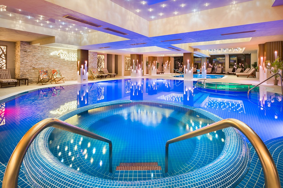 Хотелът разполага с четири вътрешни басейна с температура на водата от 33 до 37°C и външно джакузи с гореща вода 38°C. Има и реновирана термална зона, която включва билкова сауна, финландска сауна, инфрачервена сауна, парна баня, студена стая, релакс зона и съвременно оборудвана фитнес зала са част от СПА центъра на комплекса.