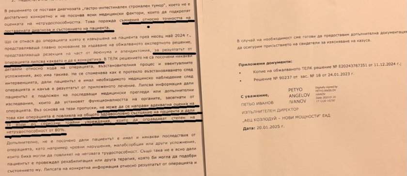 Директорът на „ Нови мощности “ ЕАД не считал за задоволително и написаното от онкокомисията след интервенцията, открила рака при неговата служителка. Твърди, че не било ясно дали имало затруднения от нея, дали били нужни спомагателни проучвания, дали се е стигнало до чревни нарушавания.