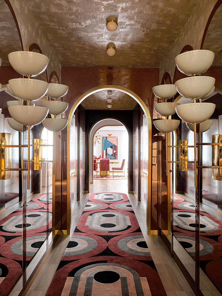 В този апартамент арката участва още от входното пространство, придавайки му грациозност. Коридорът към вътрешността на дома е облицован с огледални панели, които основават забавна игра на отблясъци. Стенните аплици, с тяхната съвсем скулптурна форма, таванът със сивата искряща мазилка, килимът с едрите претекстове са все детайли, които ни приготвят за пищността, която ни чака.