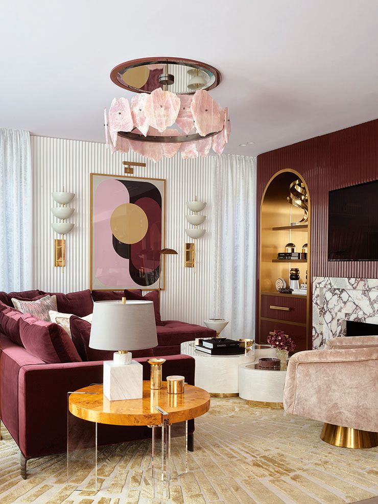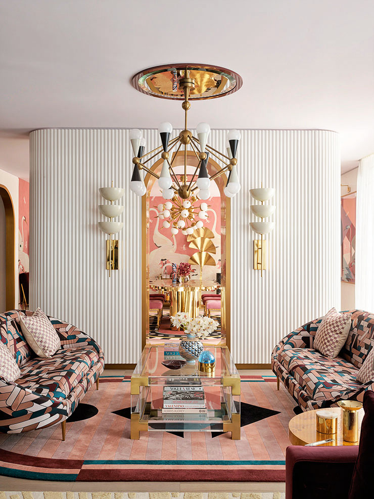 Интериорът на дома ни посреща с детонация от цветове, текстури и претекстове. Преобладават розовите тонове и месинговите акценти.Собствениците имат сбирка от мебели на интериорния дизайнер Джонатан Адлър, които желаят да впишат в новия интериор. „ Обичам цвета, остроумието и изобретателността на формата, присъстващи в предложенията на Адлър – продължава описа си Грег, – и чаках с неспокойствие да ги включа в трансформацията на жилището. Исках с тях да изразя пристрастеността на притежателите към специалността им и да подредя мебелите като бижута, на които да се радват всеки ден. “