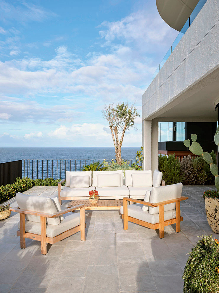 В дневната зона да вземем за пример е сложено голямо бяло канапе, което заема огромна част от пространството, само че не го натоварва, с помощта на силуета му, създаващ асоциация с облак. Килим с приятни сиво-сини нюанси, ниски мраморни масички и фотьойл с истинска форма допълват композицията.Широките плъзгащи се прозорци насищат интериора със светлина, само че най-много заличават границата с екстериора и разрешават на погледа гладко да се зарее далеко към морската простор.