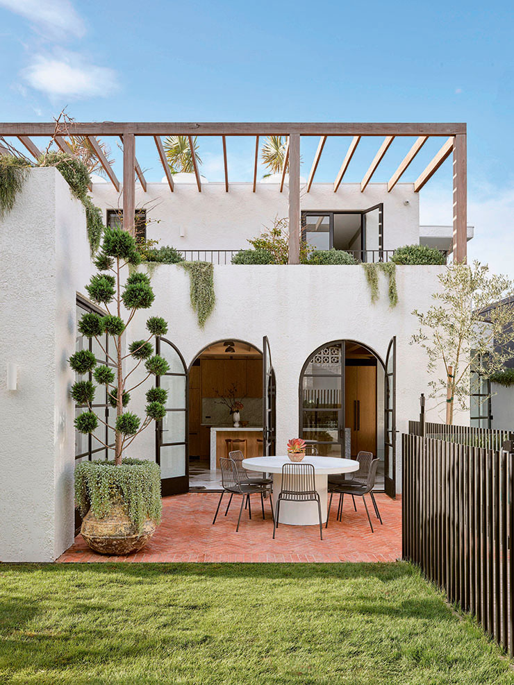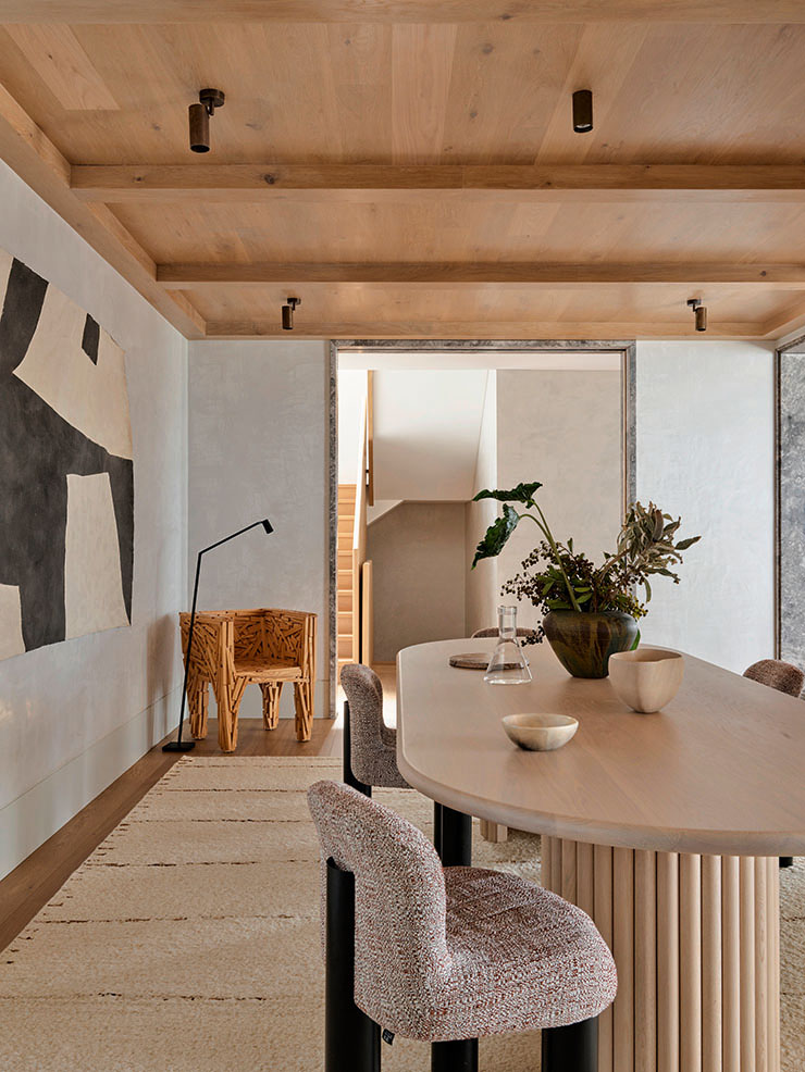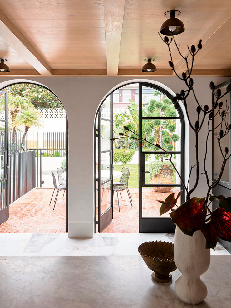 В зоната на кухнята структурата е била подсилена със стоманени подпори, които в този момент са изцяло скрити от дървения таван, създаващ топла атмосфера с помощта на приятния си ярък колорит. Мраморният пачуърк, определен за настилка, както и обемният мраморен кухненски остров пък носят чувство за рустикална прохлада, създавайки баланс.Аркообразната форма, която се повтаря на доста места в интериора, тук откриваме в двете порти, които свързват кухнята с екстериора. Тяхната железна структура елегантно рамкира гледката към екзотичната растителност.