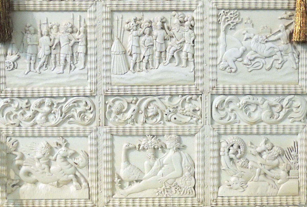 Дървеният престол е затрупан с плочки от слонова кост, което е отпратка към библейския престол на цар Соломон. На плочките са издълбани подиуми от живота на цар Давид. Над облегалката се издига двуглав орел, който е златен и увенчава креслото.