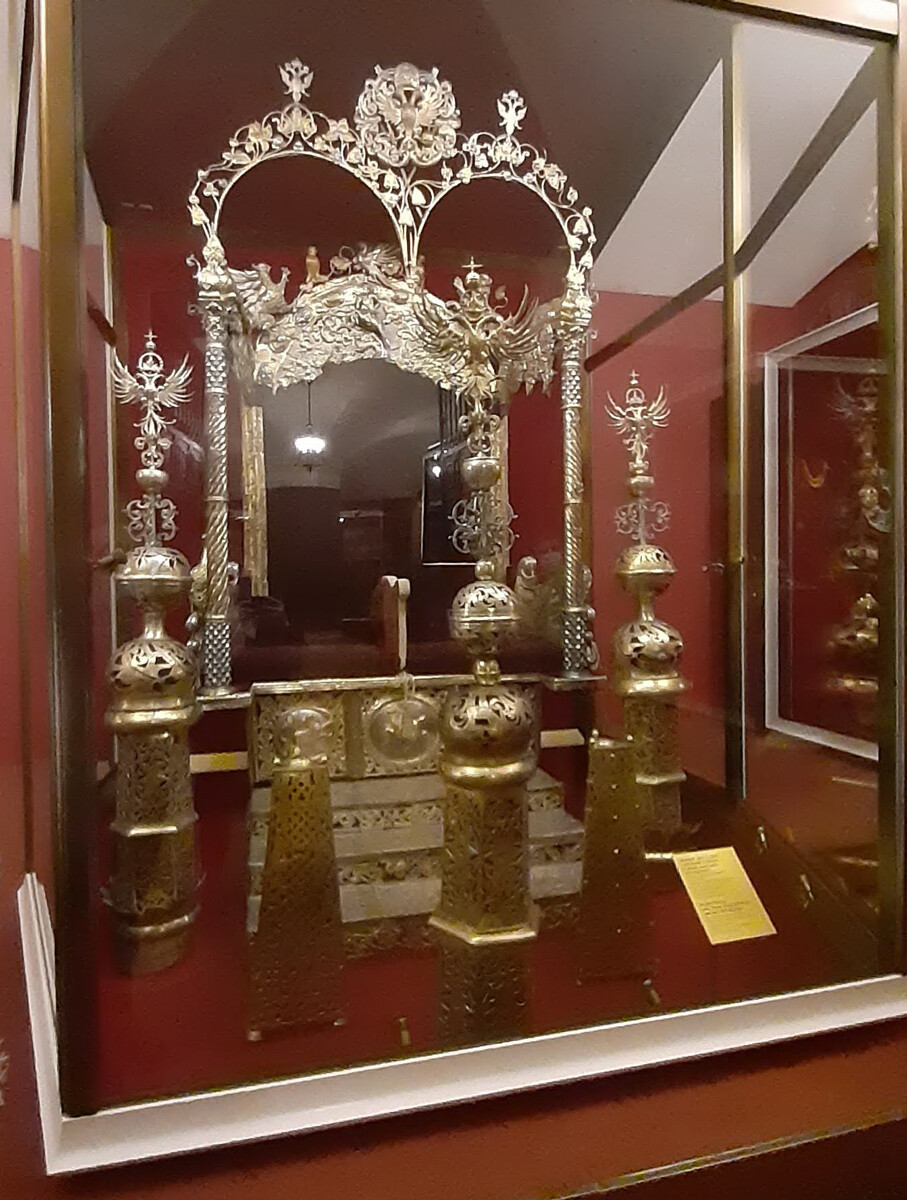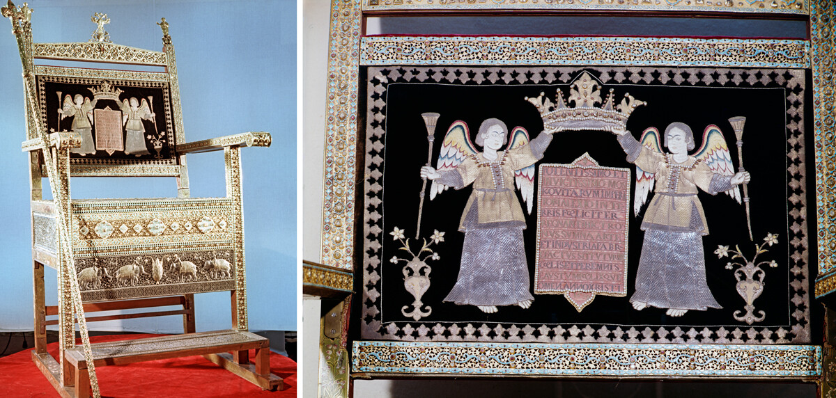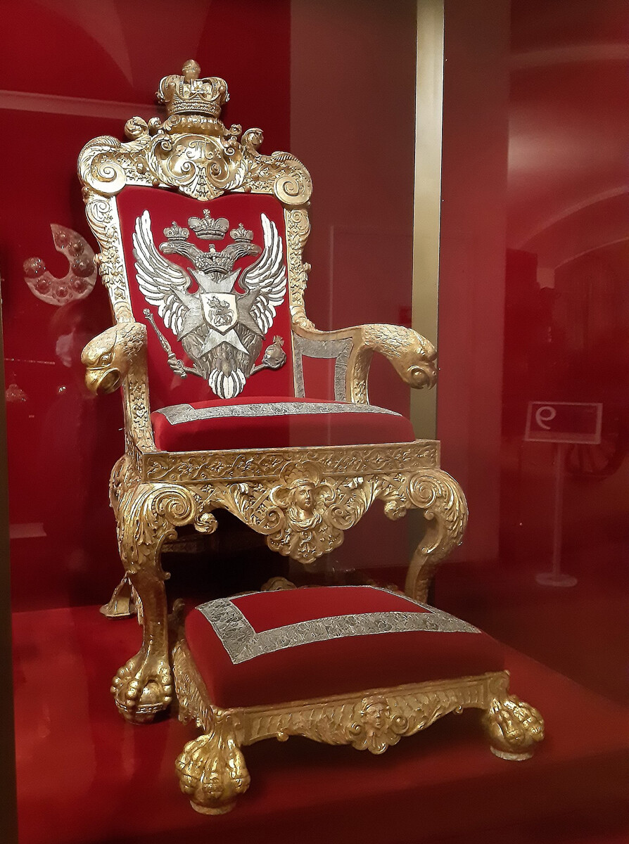 Позлатеният престол е изпълнен в бароков жанр с щамповани фигури върху метал. Той е богато декориран със знаци на властта – двуглави орли, лъвове, еднорози, корони и кълба с кръстове. Седалките са тапицирани с кадифе.