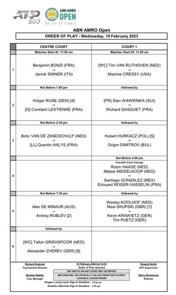 За разлика от централния корт, то на корт номер 1 няма умишлена пауза преди 13 и 15:30 часа, тъй че мачовете ще се изнижат един след различен. Трети мач на централния корт е сред Ботик ван де Зандсхулп и Куентин Халис, като уредниците разумно са дали желание на локална звезда, нищо че в международен мащаб Григор против Хуркач ще бъде много по-гледан.