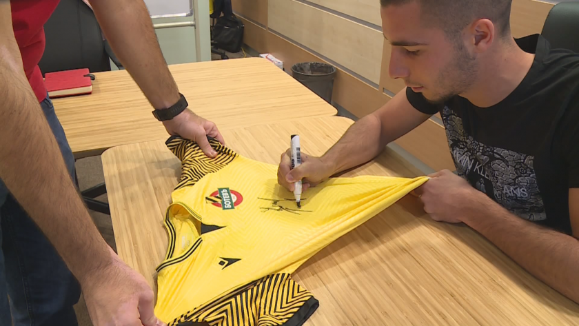 А тениската и топката, които получи от екипа ни, се подредиха до раницата му.