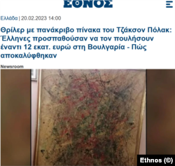 Публикации за открита картина, която може да е на Полък, при следствие на проведена група се появяват още на 20 февруари в гръцки медии. Една от тях е изданието, което оповестява, че са задържани четирима души, преговаряли да продадат платното за 12 млн. евро. На фрагментите от репортажа се вижда същото произведение, за което се оповестява, че е иззето в България.