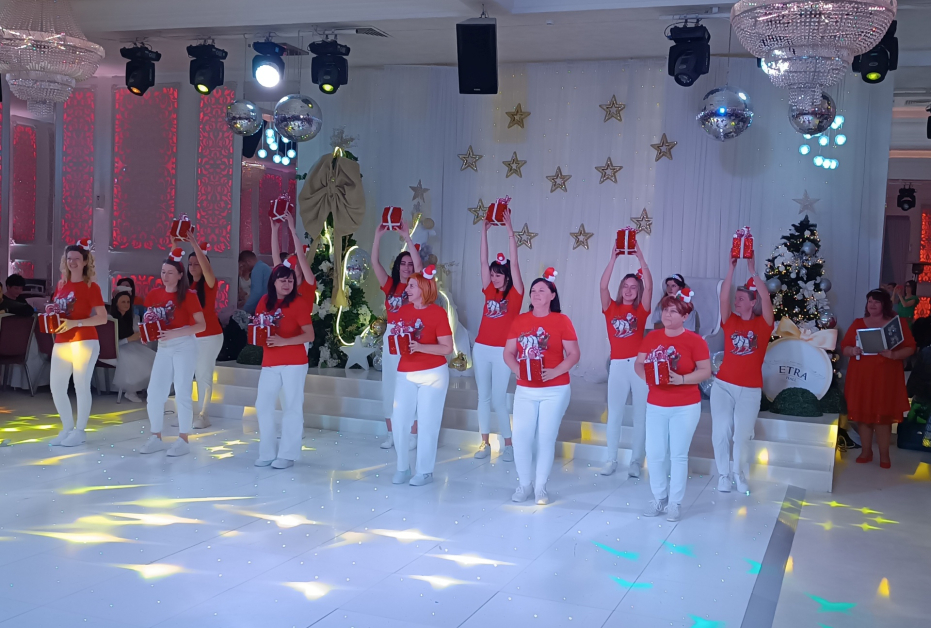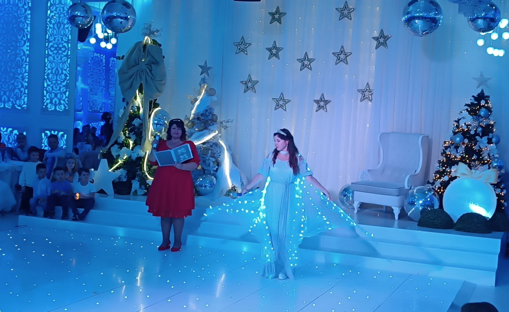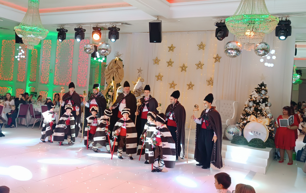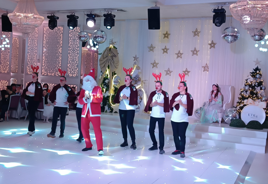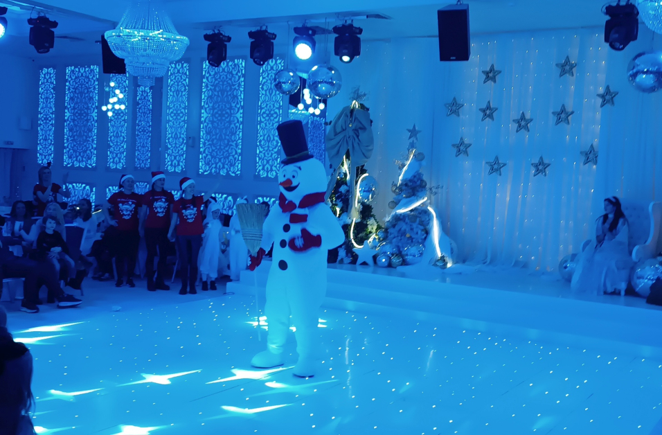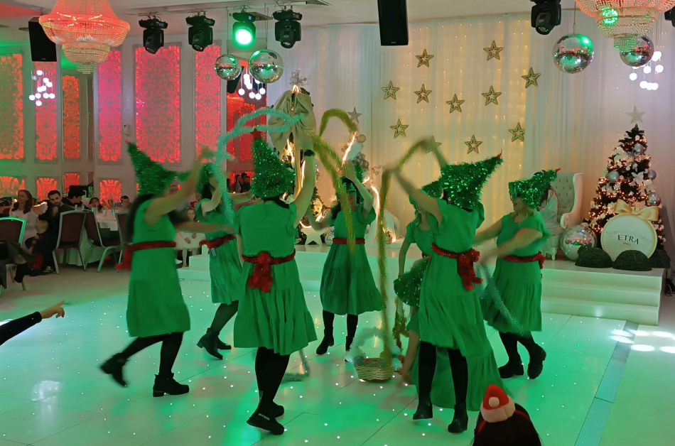 снежинки, Дядо Коледа, съпроводен от своите елени, елхички, снежен човек и коледари. Учителите също изненадаха своите дребни ученици, изпълнявайки радостен танц на джуджетата.