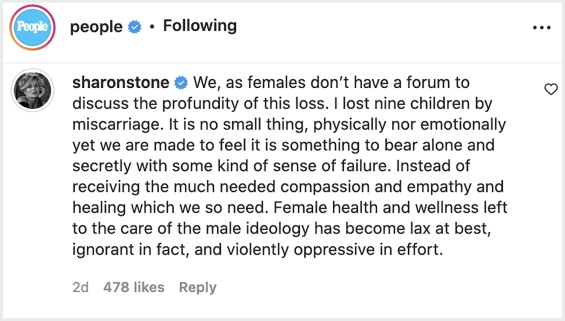 " Ние като дами нямаме конгрес или специфична платформа, където да обсъждаме дълбочината на тази загуба. Загубих девет деца заради импровизиран аборт. Не е малко, нито физически, нито прочувствено, само че въпреки всичко сме принудени да усещаме, че това е нещо, което би трябвало да преодолеем сами и скрито, с възприятие за личен неуспех. Вместо да получим по този начин нужното състрадание, както и съпричастност, и излекуване, от което се нуждаем ", написа Шарън.