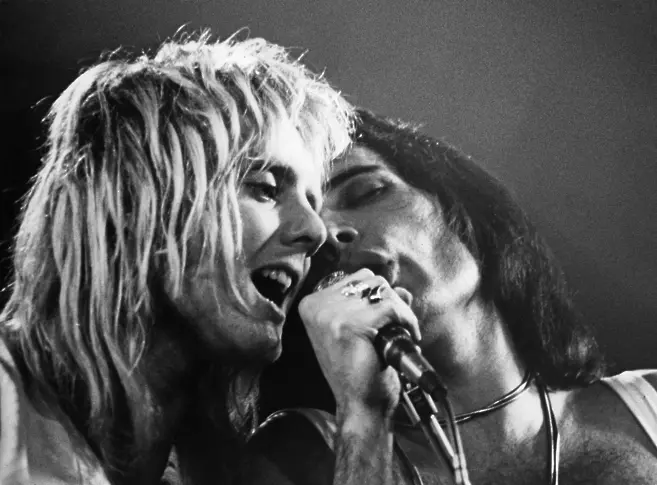 Барабанистът Роджър Тейлър и Фреди Меркюриот английската рок група Queen свирят в Playhouse в Единбург, Шотландия, 1 септември 1976 година, фотография: Getty Images