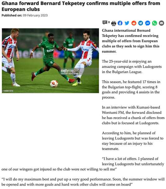 Една от звездите на Лудогорец - Бърнард Текпетей, е възнамерявал да напусне отбора през зимния трансферен прозорец, само че тежката травма на неговия съотборник Рик Джонатан е стопирала продажбата му. Това твърди самият футболист пред ганайските медии.