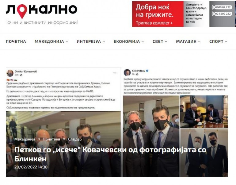 Водеща тематика в македонските медии се трансформира „ изсичането “ на премиера им Димитър Ковачевски от българския му сътрудник Кирил Петков от общата им фотография с държавния секретар на Съединени американски щати Антъни Блинкен.