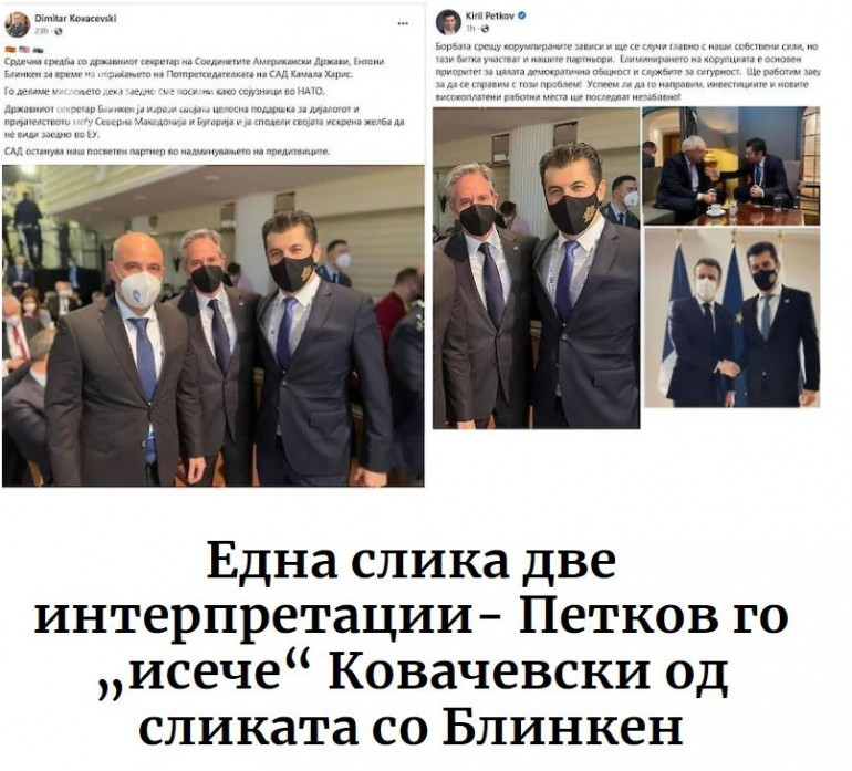 Журналистите от „ Вечер “ пишат, че първо фотографията е оповестена от Ковачевски и на нея са тримата, само че няколко часа по-късно министър-председателят на България Петков разгласява същата фотография с Блинкен в профила си във Facebook, само че отрязва Ковачевски.