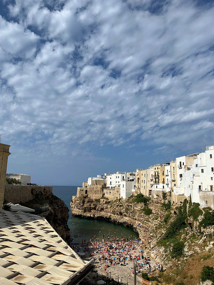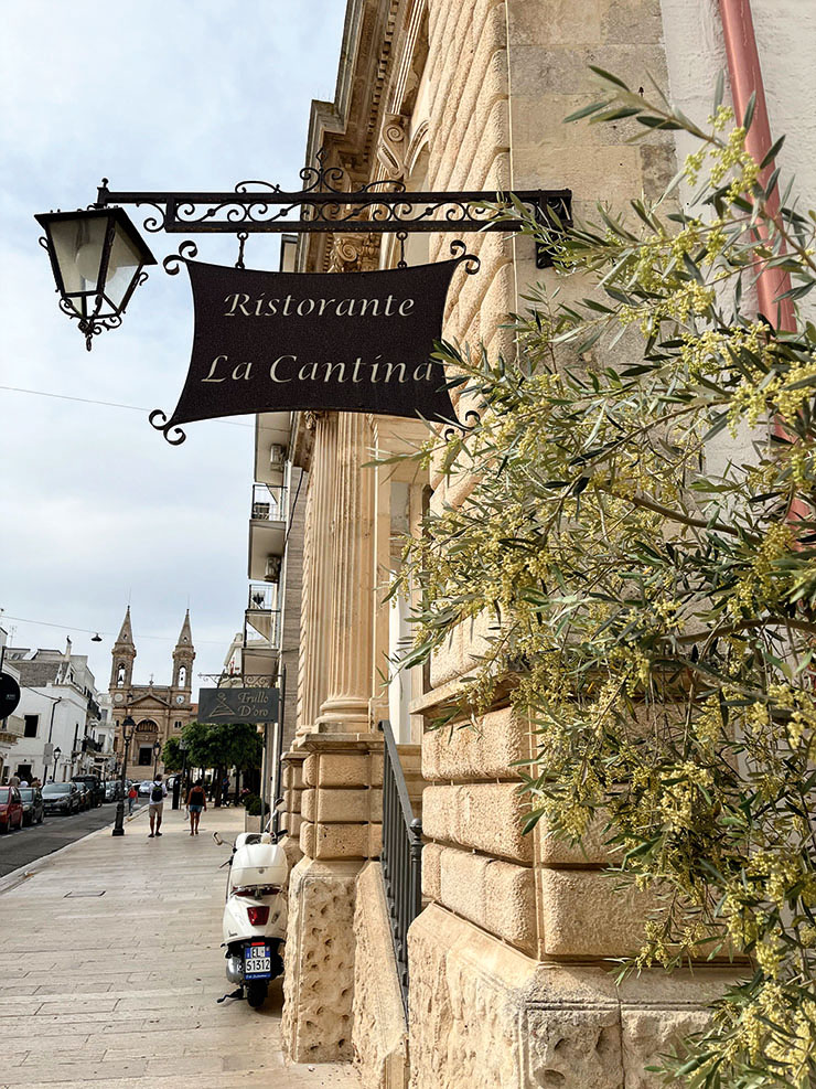 Спомен за добра храна там е визитата ми в дребното ресторантче La Cantina с невероятни антипасти с няколко типа моцарела и бурата, паста Макерончини (Maccheroncini) с патладжан, чери домати и щедро бурата и забележителната Чима ди рапа (зеленолистно леко горчиво растение Cima di rapa), задушена със зехтин и поднесена върху канапе от пюре от земна ябълка. Този зеленолистен зарзават пробвах и в тестото на таралите (хрупкави гевречета Taralli) в Бари – изумителен е. Струва си да го откриете и вие като вкусово прекарване!От туристическите места в Пулия за мен Полиняно а маре (Polignano a mare) се подрежда преди всичко, може би поради близостта на морето и кокетните дребни магазини за авторски бижута и изкуство.