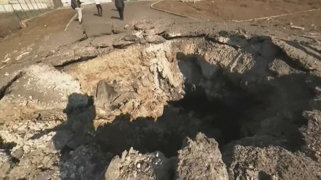 Румънският екип демонстрира какъв брой огромен е ударът по разрушените пластове асфалт. Дупката е с диаметър 4-5 метра и с дълбочина 3-4 метра.